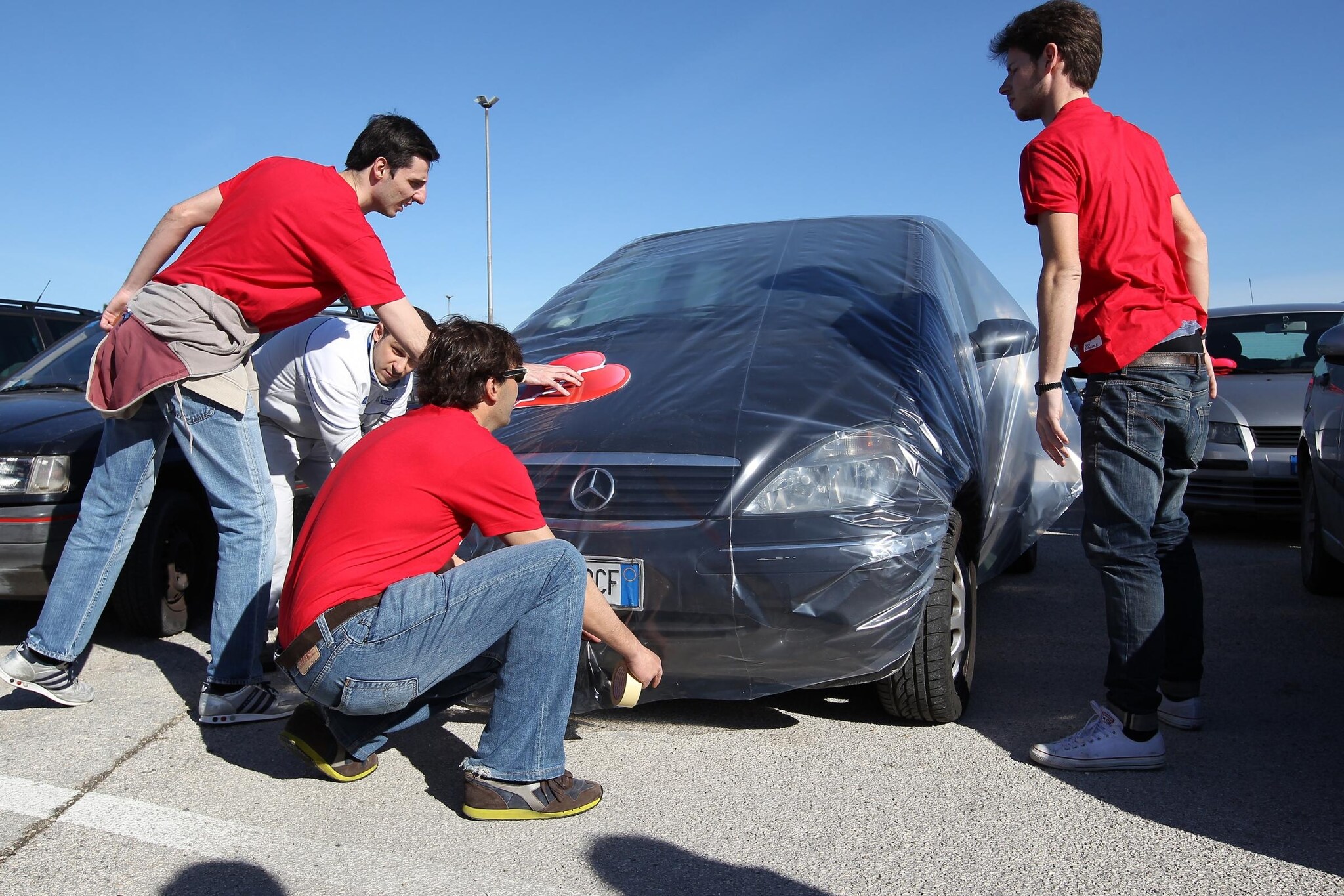 La Fiat impacchetta le auto "straniere" dei dipendenti apponendo un cuore spezzato. Sulle auto di marca FIAT viene messo un cuore intero.