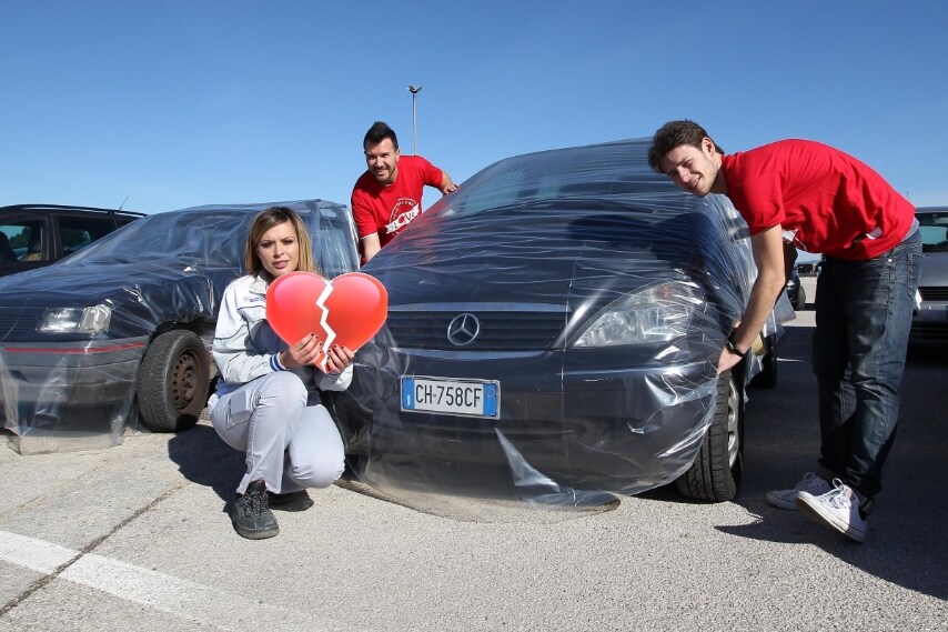 La Fiat impacchetta le auto "straniere" dei dipendenti apponendo un cuore spezzato. Sulle auto di marca FIAT viene messo un cuore intero.