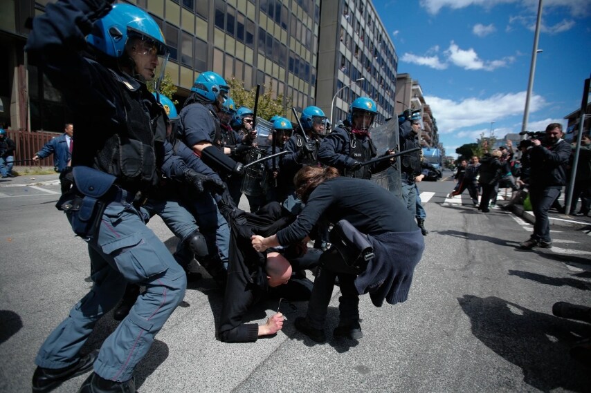 Roma, nella zona Montagnola lo sgombero di uno stabile occupato si trasforma in una giornata di guerriglia: manifestanti arroccati e polizia in assetto antisommossa. In queste immagini i poliziotti (otto) bloccano un giovane manifestante)