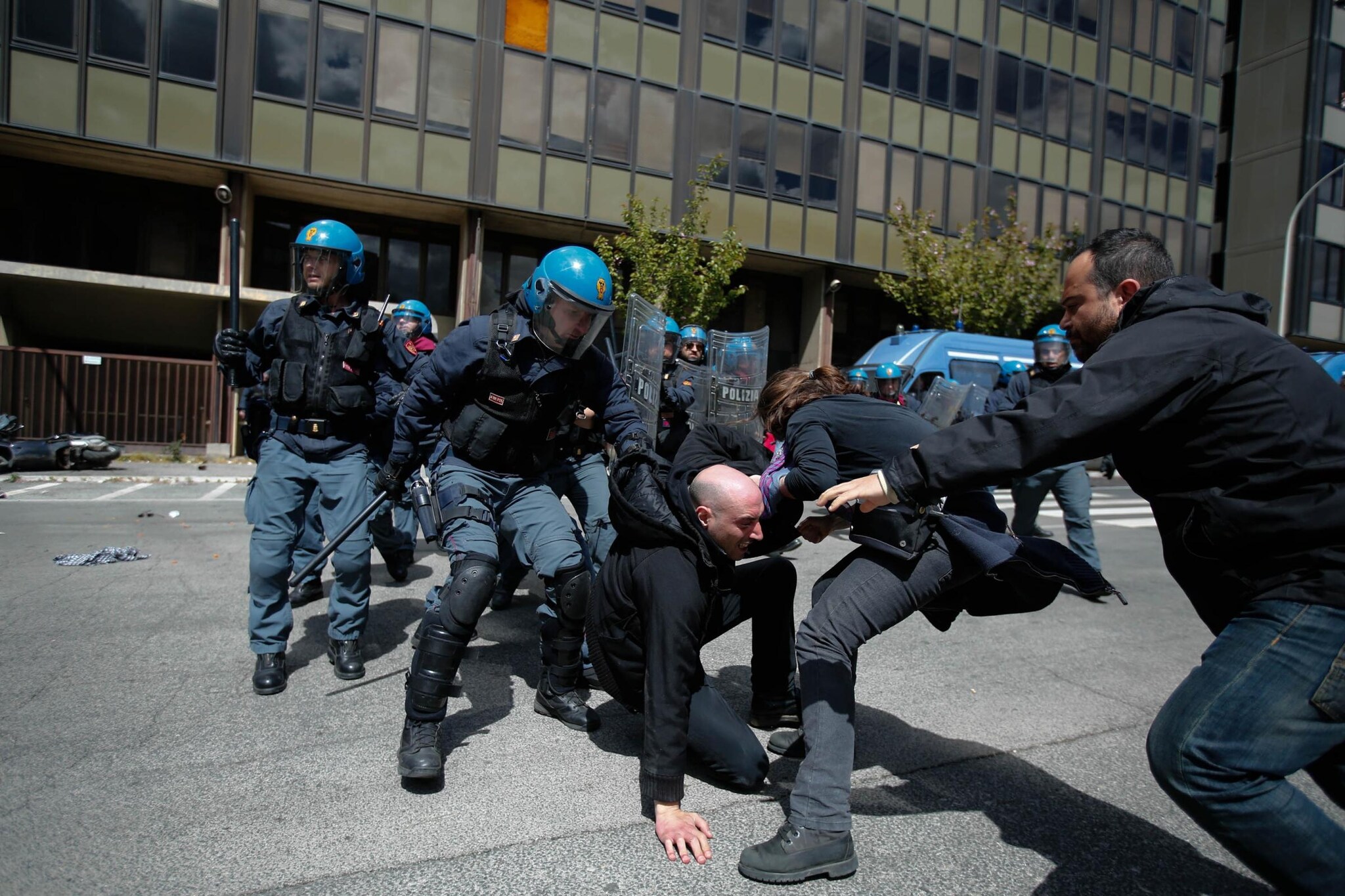 Roma, nella zona Montagnola lo sgombero di uno stabile occupato si trasforma in una giornata di guerriglia: manifestanti arroccati e polizia in assetto antisommossa. In queste immagini i poliziotti (otto) bloccano un giovane manifestante)