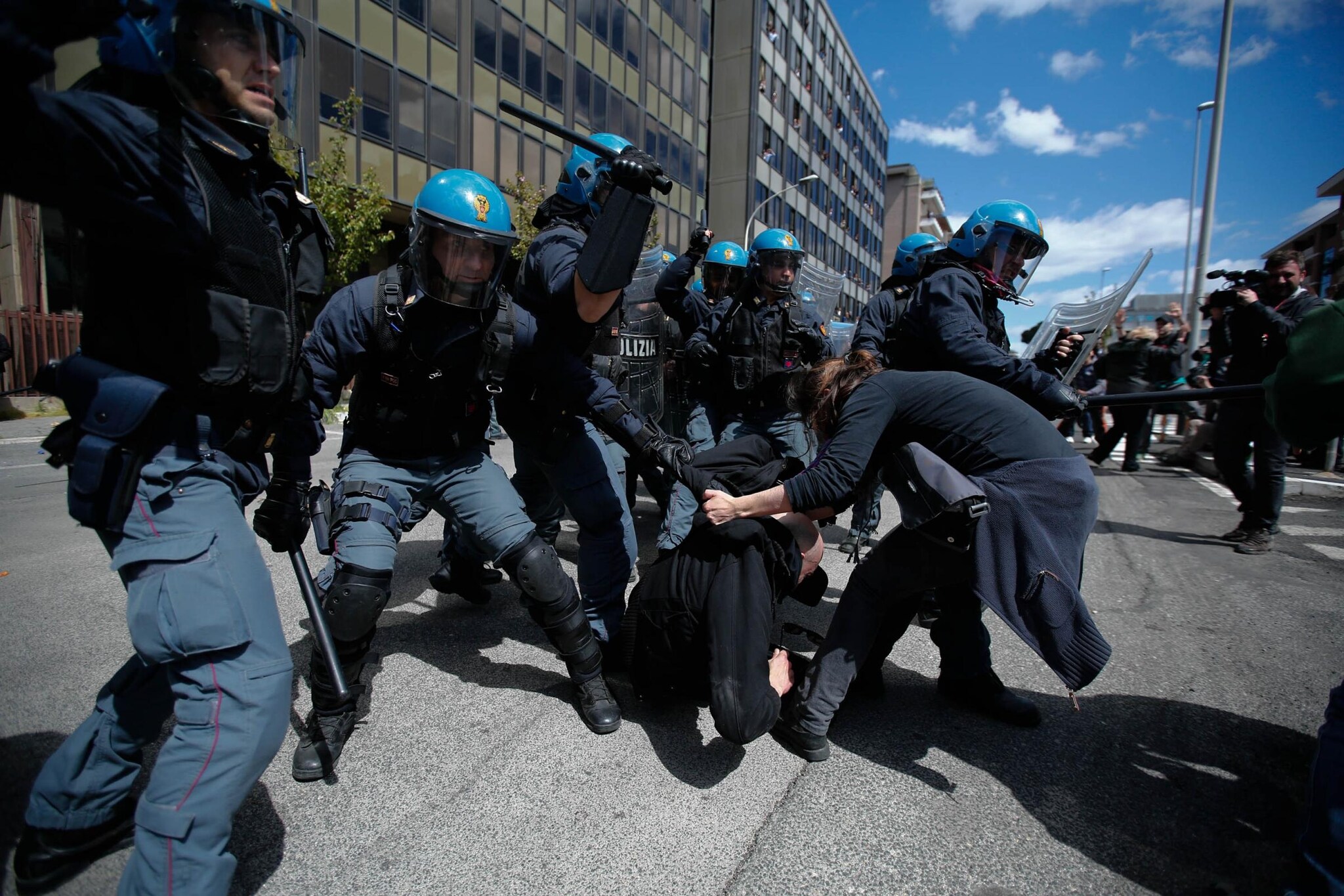 Roma, nella zona Montagnola lo sgombero di uno stabile occupato si trasforma in una giornata di guerriglia: manifestanti arroccati e polizia in assetto antisommossa. In queste immagini i poliziotti (otto) bloccano un giovane manifestante)