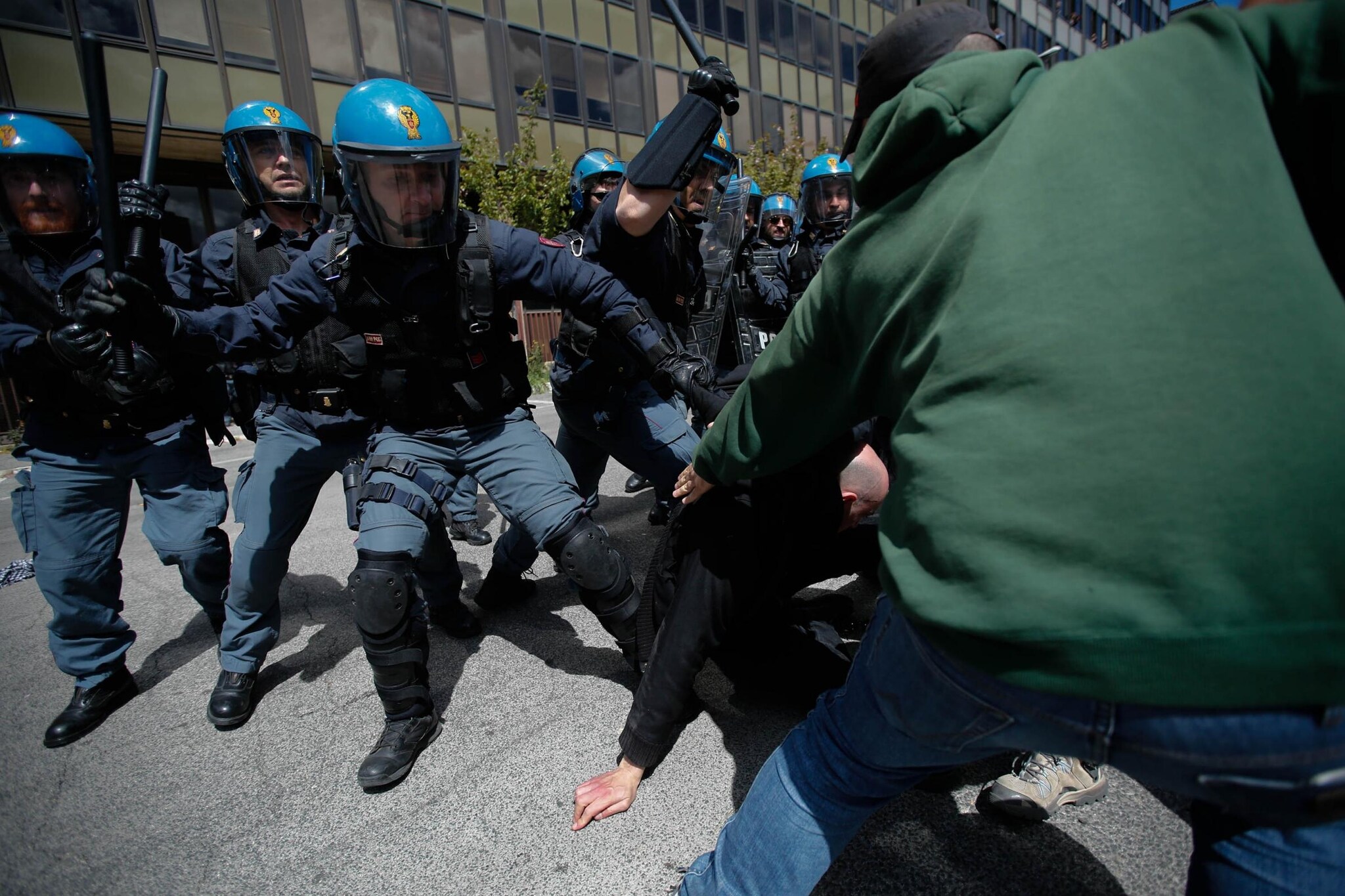 Roma, nella zona Montagnola lo sgombero di uno stabile occupato si trasforma in una giornata di guerriglia: manifestanti arroccati e polizia in assetto antisommossa. In queste immagini i poliziotti (otto) bloccano un giovane manifestante)