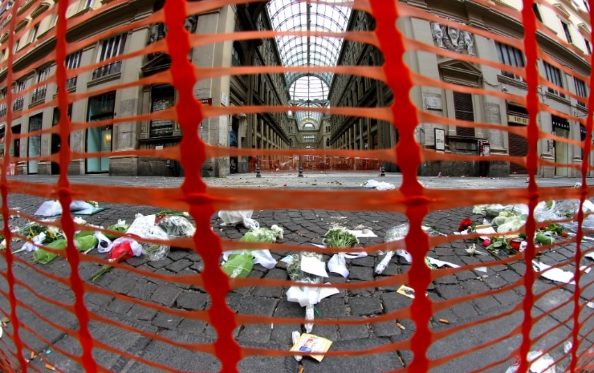 I cittadini si stringono alla famiglia di Salvatore Giordano, morto ieri a soli 14 anni per il crollo di un cornicione staccatosi dalla galleria Umberto e caduto su via Toledo, oggi tappezzata di fiori, lettere e candele.