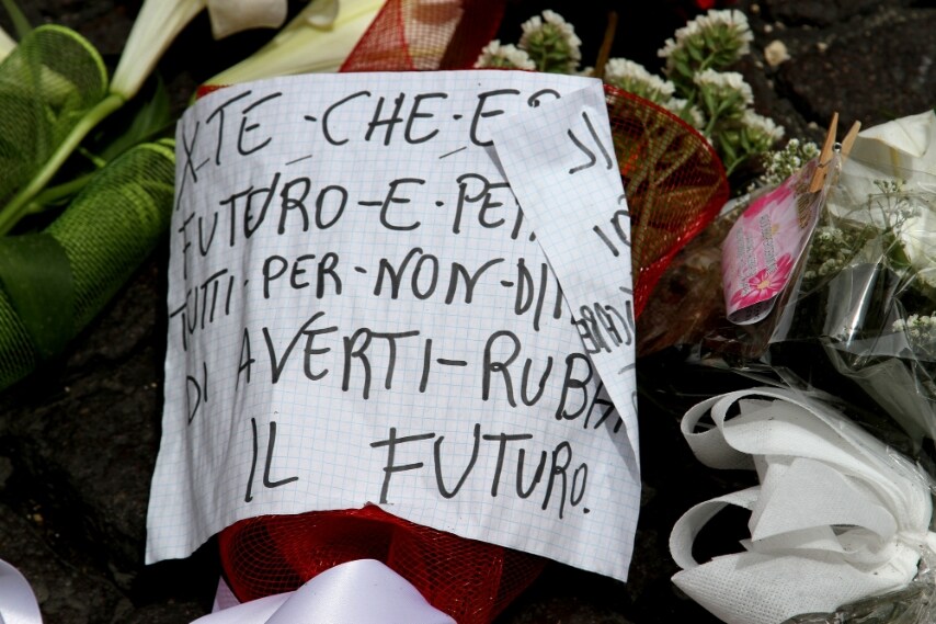 I cittadini si stringono alla famiglia di Salvatore Giordano, morto ieri a soli 14 anni per il crollo di un cornicione staccatosi dalla galleria Umberto e caduto su via Toledo, oggi tappezzata di fiori, lettere e candele.