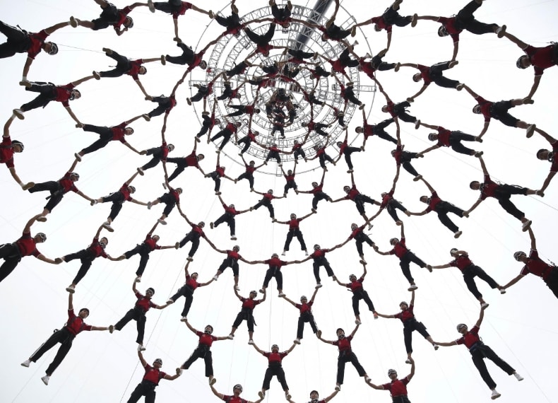Le spettacolari coreografie acrobatiche realizzate nel cielo dagli studenti della più grande scuola di arti marziali in Cina, la Tagou. Centoventi stuntmen apriranno con le loro forme geometriche i Giochi olimpici giovanili che si disputeranno a Nanchino, in Cina, dal 16 al 28 agosto.