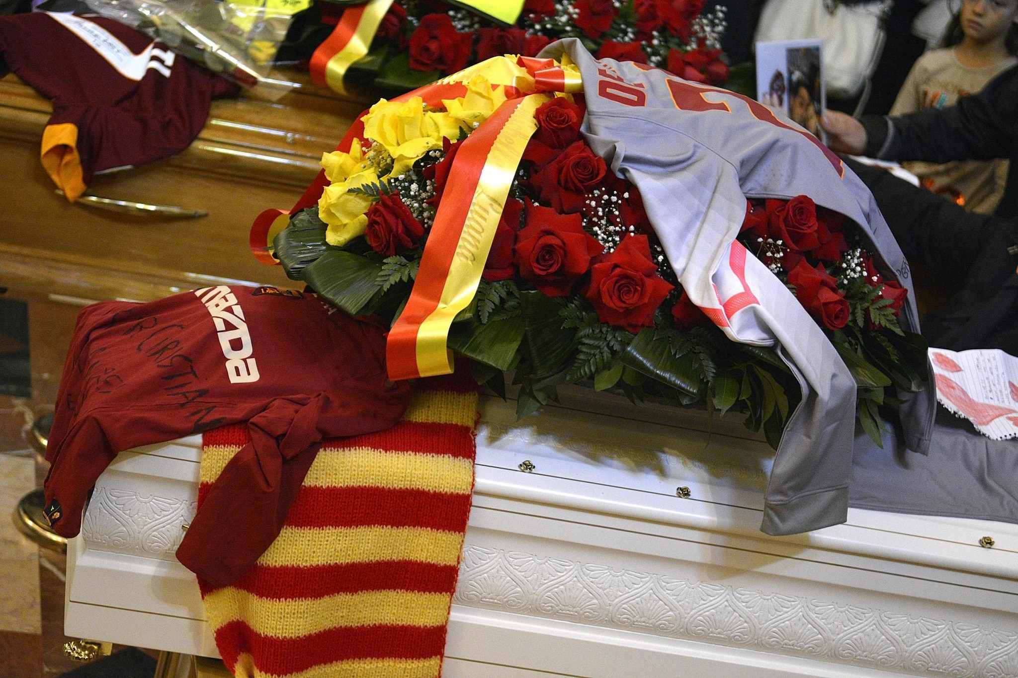 Striscioni, palloncini colorati, sciarpe e magliette giallorosse, l'inno di Antonello Venditti al passaggio delle bare. Erano in migliaia oggi a dare l'addio a Stefano e al piccolo Cristian, morti in un incidente stradale dopo aver passato una serata insieme allo stadio per vedere Roma - Bayern Monaco