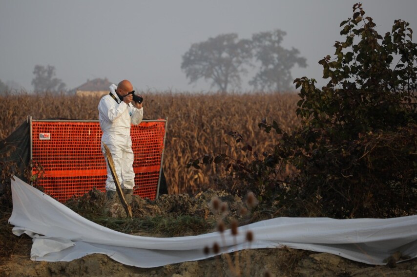 Il ritrovamento del cadavere di Elena Ceste in un fosso a poche centinaia di metri dalla sua casa. Nelle foto i Carabinieri e la scientifica sul luogo del ritrovamento utilizzano setacci per cercare resti del corpo.