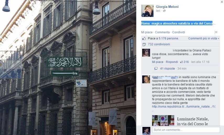 La presidente di Fratelli d’Italia ha pubblicato una foto sul suo profilo Facebook in cui si vede una bandiera verde con un’iscrizione in arabo (come fa notare il sito glistatigenerali.com, si tratta della shahada, la professione di fede enunciata da ogni buon musulmano). A corredo la scritta che sa molto di polemica: "Roma: magica atmosfera natalizia a via del Corso”. I commenti degli utenti lasciano ben intendere il velato sarcasmo xenofoba di cui è intrisa la didascalia: "Ringraziamo Alfano....siamo diventati una fogna a cielo aperto....va bene un numero chiuso come in svizzera ma non mezza Africa da noi..." o "ricordatevi la Oriana Fallaci cosa disse, soccomberemo..... aveva visto lungo!". In realtà però la stragrande maggioranza dei commenti, è di utenti che ci tengono a fare una dovuta precisazione: "in realtà sono luminarie che rappresentano le bandiere di tutto il mondo questa è la bandiera dell'arabia saudita stato amico a cui l'italia è legata da un trattato di amicizia e accordo commerciale. vedo tanta ignoranza nei commenti. Meloni deludente che fa propaganda sul nulla, e approfitta del razzismo cieco della gente".