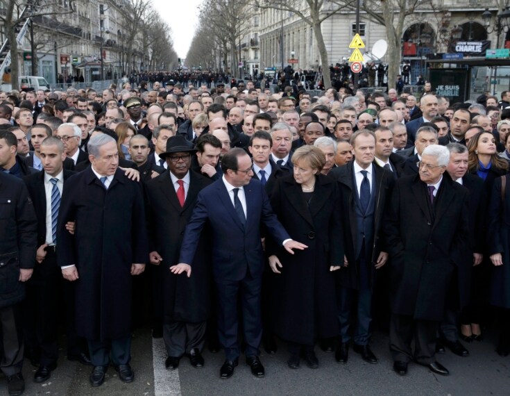 Oltre un milione di persone in piazza a Parigi prendono parte al corteo contro il terrorismo dopo le strage nella sede del gironale Charlie Hebdo.