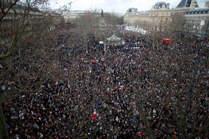 Oltre un milione di persone in piazza a Parigi prendono parte al corteo contro il terrorismo dopo le strage nella sede del gironale Charlie Hebdo.
