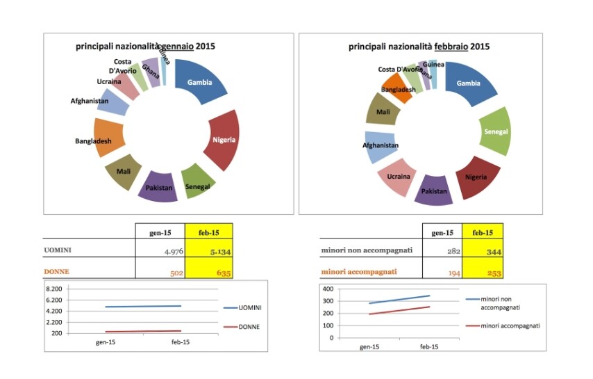 69 sbarchi nei primi due mesi del 2015 contro i 46 dello scorso anno: in totale sono stati 7.882 i migranti che sono approdati sulle coste italiane (+43%). Nelle strutture di accoglienza si trovano 67.128 migranti mentre i richiedenti asilo sono 5.769; i minori in attesa di un posto di accoglienza sono 840 di cui 430 solo in Sicilia. Su 170 mila migranti arrivati in Italia nel 2014, ben 26 mila sono minorenni.