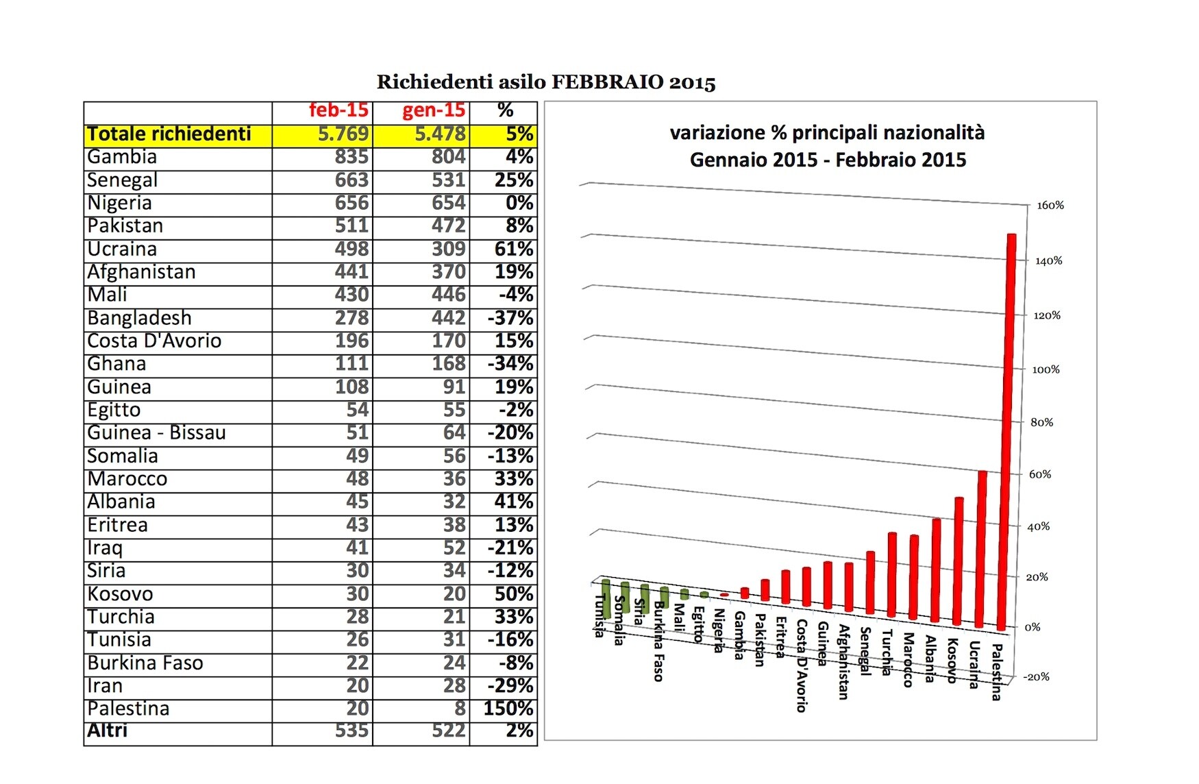 69 sbarchi nei primi due mesi del 2015 contro i 46 dello scorso anno: in totale sono stati 7.882 i migranti che sono approdati sulle coste italiane (+43%). Nelle strutture di accoglienza si trovano 67.128 migranti mentre i richiedenti asilo sono 5.769; i minori in attesa di un posto di accoglienza sono 840 di cui 430 solo in Sicilia. Su 170 mila migranti arrivati in Italia nel 2014, ben 26 mila sono minorenni.