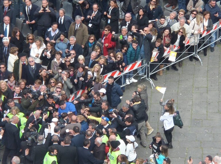 Durante la sua visita a Napoli, Papa francesco scende dalla Papamobile e si avvicina ai fedeli. Il Pontefice "rompe" così un protocollo di sicurezza organizzato da giorni, ma la sua voglia di avvicinarsi alle tantissime persone arrivate a Piazza Plebiscito lo ha spinto a fare questo gesto.