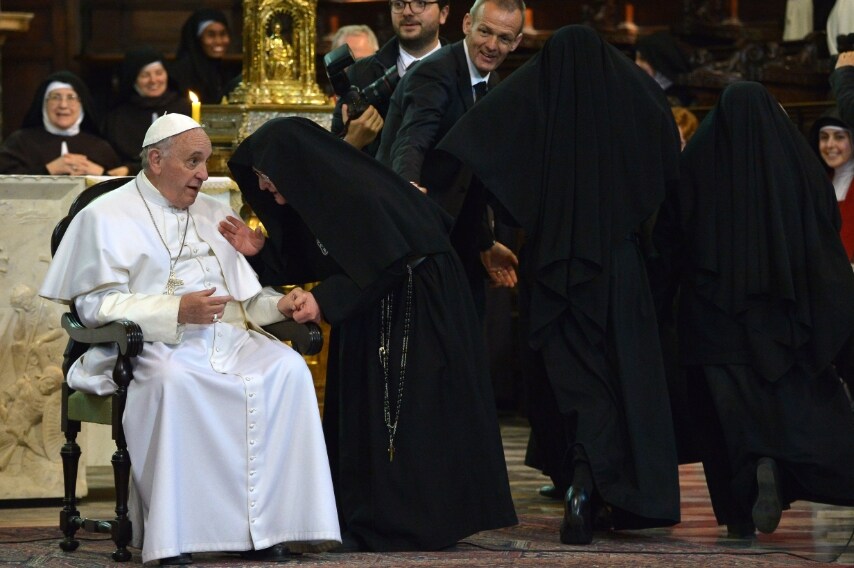 Curioso fuoriprogramma al Duomo di Napoli. Prima che Papa Francesco prendesse la parola, il Cardinale Sepe comunica al Pontefice la visita di un gruppo di suore di clausura.Le "sorelle" salite sul palco "accerchiano" Papa Francesco e sembrano non voler andare via, nemmeno dopo i "rimproveri" del Cardinale Sepe.