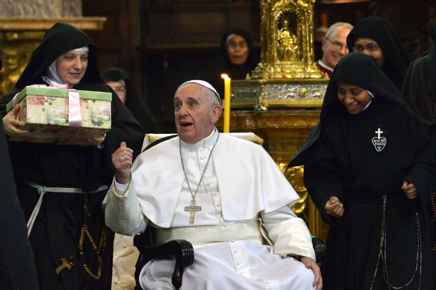 Curioso fuoriprogramma al Duomo di Napoli. Prima che Papa Francesco prendesse la parola, il Cardinale Sepe comunica al Pontefice la visita di un gruppo di suore di clausura.Le "sorelle" salite sul palco "accerchiano" Papa Francesco e sembrano non voler andare via, nemmeno dopo i "rimproveri" del Cardinale Sepe.