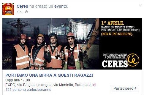 Si chiama "Portiamo una birra a questi ragazzi", l'ultimo evento creato dal noto marchio di birra danese Ceres, rivolto agli operai di Expo. L’iniziativa è stata lanciata questa mattina attraverso inserzioni pubblicitarie sui giornali e social. Ceres ha così deciso nella giornata del 1° aprile, di occuparsi degli operai al lavoro per completare in tempo utile i padiglioni, offrendo loro da bere. Che si tratti di un pesce d'aprile? Probabile, ma l'azienda sembra avere assicurato "Non è uno scherzo".