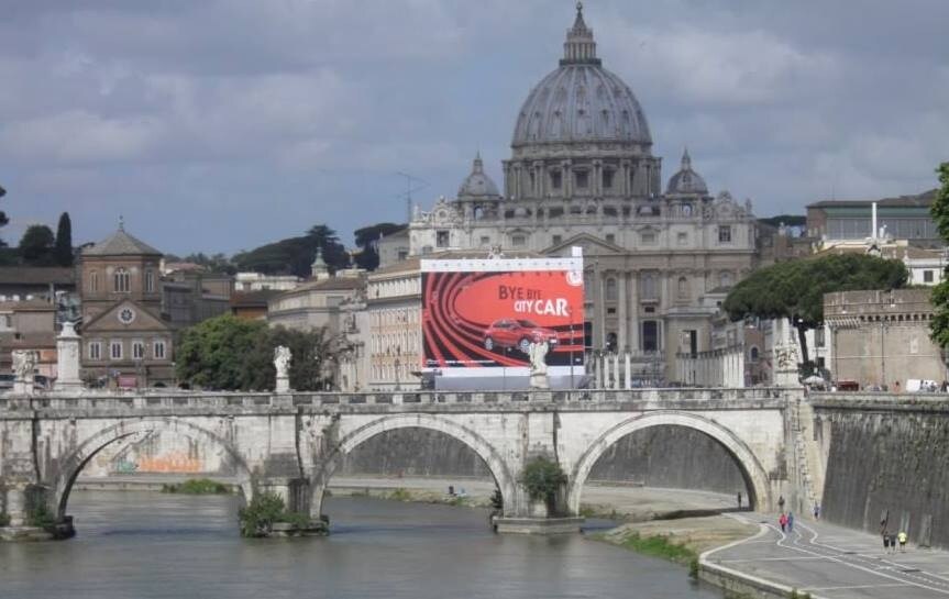“L'impossibile e l'assurdo è diventato possibile a Roma, dove da qualche giorno una enorme pubblicità rosso fuoco della Fiat campeggia ad inizio di via Conciliazione violentando tutta la visuale di piazza San Pietro da ponte Sant'Angelo e Ponte Umberto I”. A lanciare l’allarme sono le senatrici Paola Taverna e Michela Montevecchi del Movimento 5 Stelle.