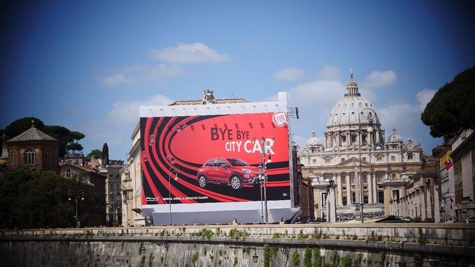 “L'impossibile e l'assurdo è diventato possibile a Roma, dove da qualche giorno una enorme pubblicità rosso fuoco della Fiat campeggia ad inizio di via Conciliazione violentando tutta la visuale di piazza San Pietro da ponte Sant'Angelo e Ponte Umberto I”. A lanciare l’allarme sono le senatrici Paola Taverna e Michela Montevecchi del Movimento 5 Stelle.