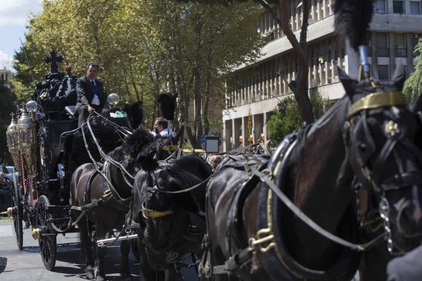La carrozza con i cavalli e la musica del Padrino per il funerale di Casamonica
