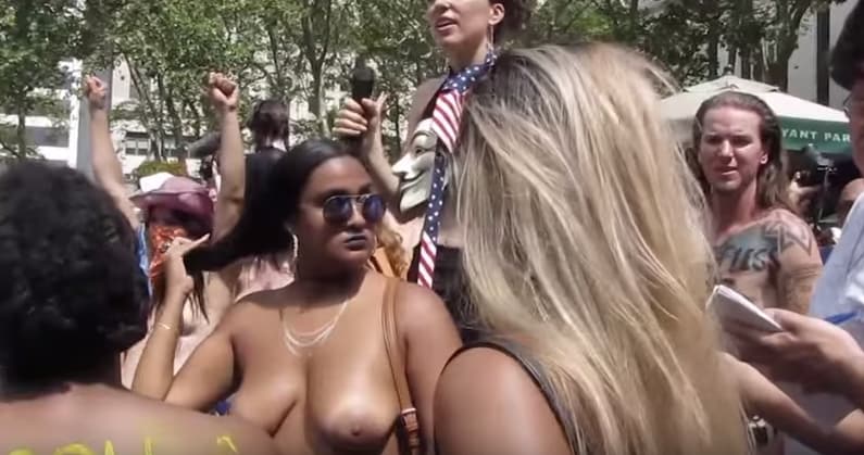 La parità della condizione uomo donna passa anche per il diritto ad andare in giro con la parte alta del corpo scoperta, ed è questo diritto che le donne americane rivendicano in più di 10 stati. "Perché andare in giro col seno nudo dovrebbe essere motivo di scandalo? Vogliamo essere libere", gridano le attiviste dal palco. Intanto lo spettacolo imperversa per le strade. Il topless in America è vietato in Utah, Indiana e Tennesse mentre negli altri Stati, benché sia legale, la pratica è stata vietata in diverse città da ordinanze locali.