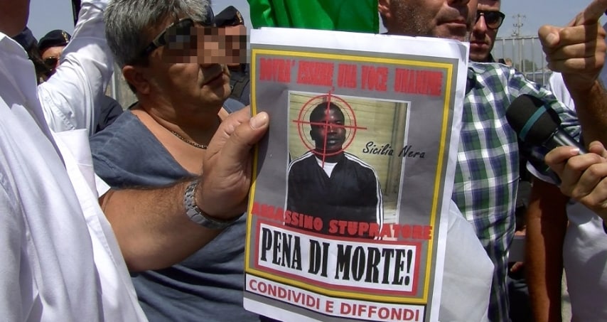 Questo pomeriggio, al Cara di Mineo, qualcuno ha anche portato un cartello choc contro l'ivoriano accusato del duplice omicidio dei coniugi Solano a Palagonia. "Pena di morte, assassino stupratore" scrivono. E sul volto di Mamadou Kamara spunta anche un mirino. Il rischio, adesso, è che possano verificarsi episodi di razzismo.