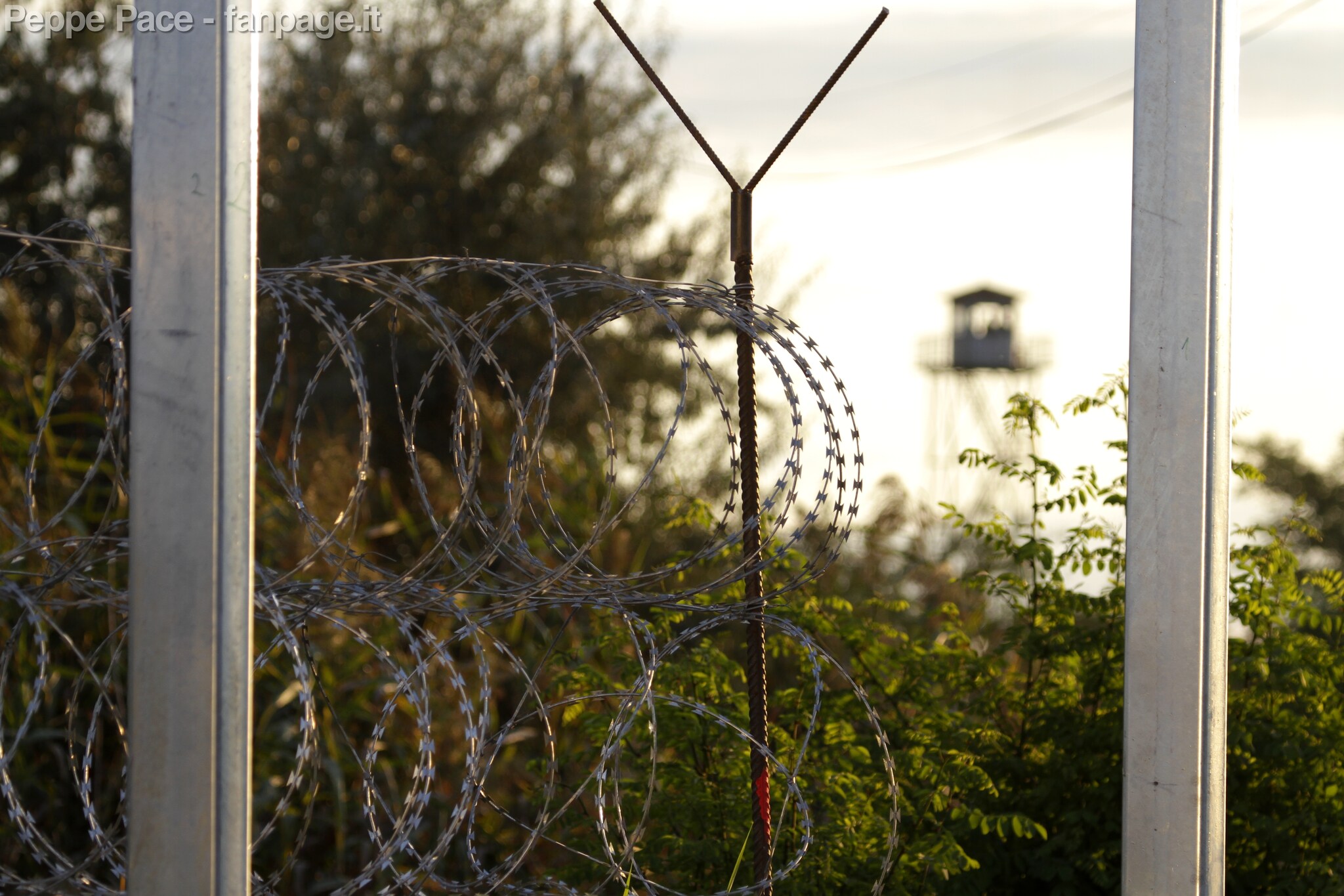 Sullo sfondo un avamposto militare serbo, in primo piano il muro che separa Serbia e Ungheria si interrompe in corrispondenza dei binari