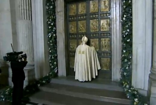 L'atto che apre ufficialmente il Giubileo 2015: l'apertura della Porta Santa. Il Pontefice apre la Porta Santa e successivamente la attraversa.