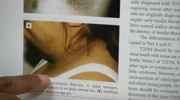 La mamma inizia a notare una macchia scura attorno al collo della figlia. Inizialmente pensa sia sporco ma la macchia non va via, anzi diventa sempre più evidente. Dopo la visita medica scoprono che la ragazza, già da tempo obesa, soffre di diabete. Quell'anello scuro è proprio uno dei segnali del diabete, tende a formarsi attorno al collo, o anche sotto le ascelle e nell'inguine. È segno che l'insulina non funziona correttamente e che il corpo non riesce a metabolizzare gli zuccheri.