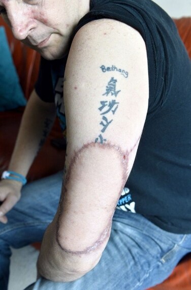 Brian Walker, 43 anni, è rimasto scioccato nello scoprire che un nodulo sul retro del suo braccio era in realtà un rarissimo tipo di cancro. Le foto pubblicate dall'agenzia Caters mostrano le fasi dell'intervento chirurgico che gli ha salvato la vita