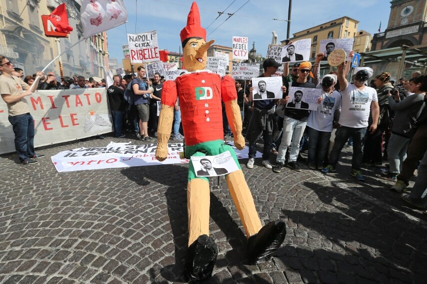 Centri sociali in corteo a Napoli per manifestare contro Matteo Renzi in visita in città per la cabina di regia a Bagnoli: un Pinocchio di cartapesta, Pulcinella col mandolino cartelli e tanti slogan: sembrava una manifestazione puramente all'insegna dell'ironia e dello sberleffo. Sul lungomare Caracciolo, invece, duri scontri con le forze dell'ordine: 4 agenti feriti.