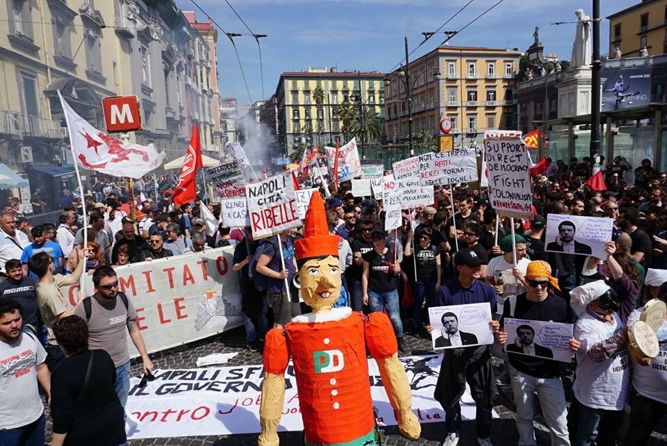 Centri sociali in corteo a Napoli per manifestare contro Matteo Renzi in visita in città per la cabina di regia a Bagnoli: un Pinocchio di cartapesta, Pulcinella col mandolino cartelli e tanti slogan: sembrava una manifestazione puramente all'insegna dell'ironia e dello sberleffo. Sul lungomare Caracciolo, invece, duri scontri con le forze dell'ordine: 4 agenti feriti.