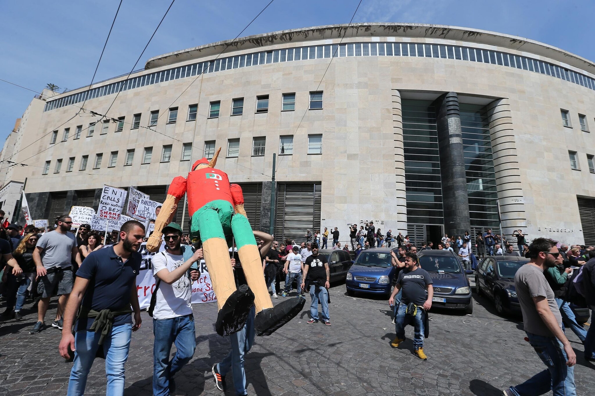 Centri sociali in corteo a Napoli per manifestare contro Matteo Renzi in visita in città per la cabina di regia a Bagnoli: un Pinocchio di cartapesta, Pulcinella col mandolino cartelli e tanti slogan: sembrava una manifestazione puramente all'insegna dell'ironia e dello sberleffo. Sul lungomare Caracciolo, invece, duri scontri con le forze dell'ordine: 4 agenti feriti.