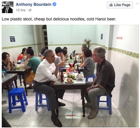 Barack Obama cliente di un ristorante di Hanoi in Vietnam, insieme al presentatore americano Anthony Bourdain. Il presidente americano siede su uno sgabellino e consuma il suo pasto, un piatto di noodle, mentre sorseggia birra e parla con Bourdain. Alla fine il conto sarà di poco superiore ai 5 euro, ma comunque Obama non riuscirà a pagarlo dato che il ristoratore contento della visita, deciderà di offrire la cena. Le foto sono state pubblicate dallo stesso Bourdain sui propri profili "social" (Facebook e Instagram).