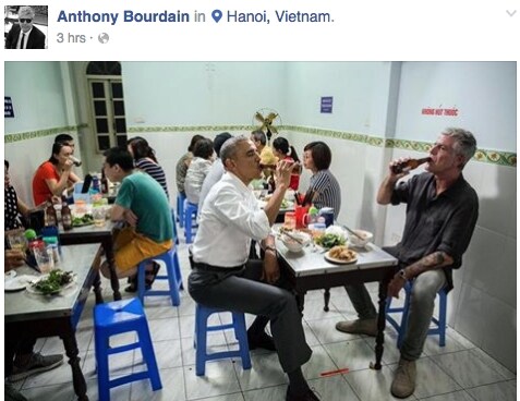 Barack Obama cliente di un ristorante di Hanoi in Vietnam, insieme al presentatore americano Anthony Bourdain. Il presidente americano siede su uno sgabellino e consuma il suo pasto, un piatto di noodle, mentre sorseggia birra e parla con Bourdain. Alla fine il conto sarà di poco superiore ai 5 euro, ma comunque Obama non riuscirà a pagarlo dato che il ristoratore contento della visita, deciderà di offrire la cena. Le foto sono state pubblicate dallo stesso Bourdain sui propri profili "social" (Facebook e Instagram).