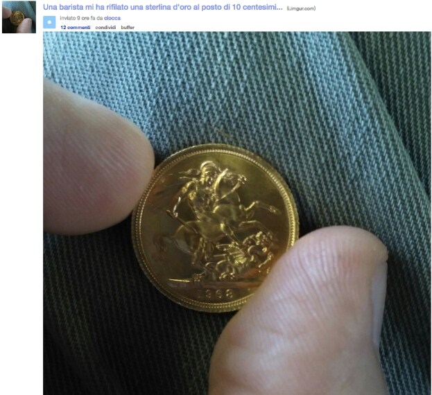 Un ragazzo racconta di aver ricevuto come resto, un'altra moneta al posto di quella da 10 centesimi di euro e ha postato una foto della stessa, sul noto blog Imgur.com. Infatti si tratterebbe (non vi è la certezza dato che viene mostrata solo una foto della stessa) di una sterlina in oro, moneta tuttora coniata dalla Royal Mint (zecca reale inglese). Questa moneta è comunque tra le più suggestive ancora in circolazione, emessa per la prima volta nel 1489 da Enrico VII.