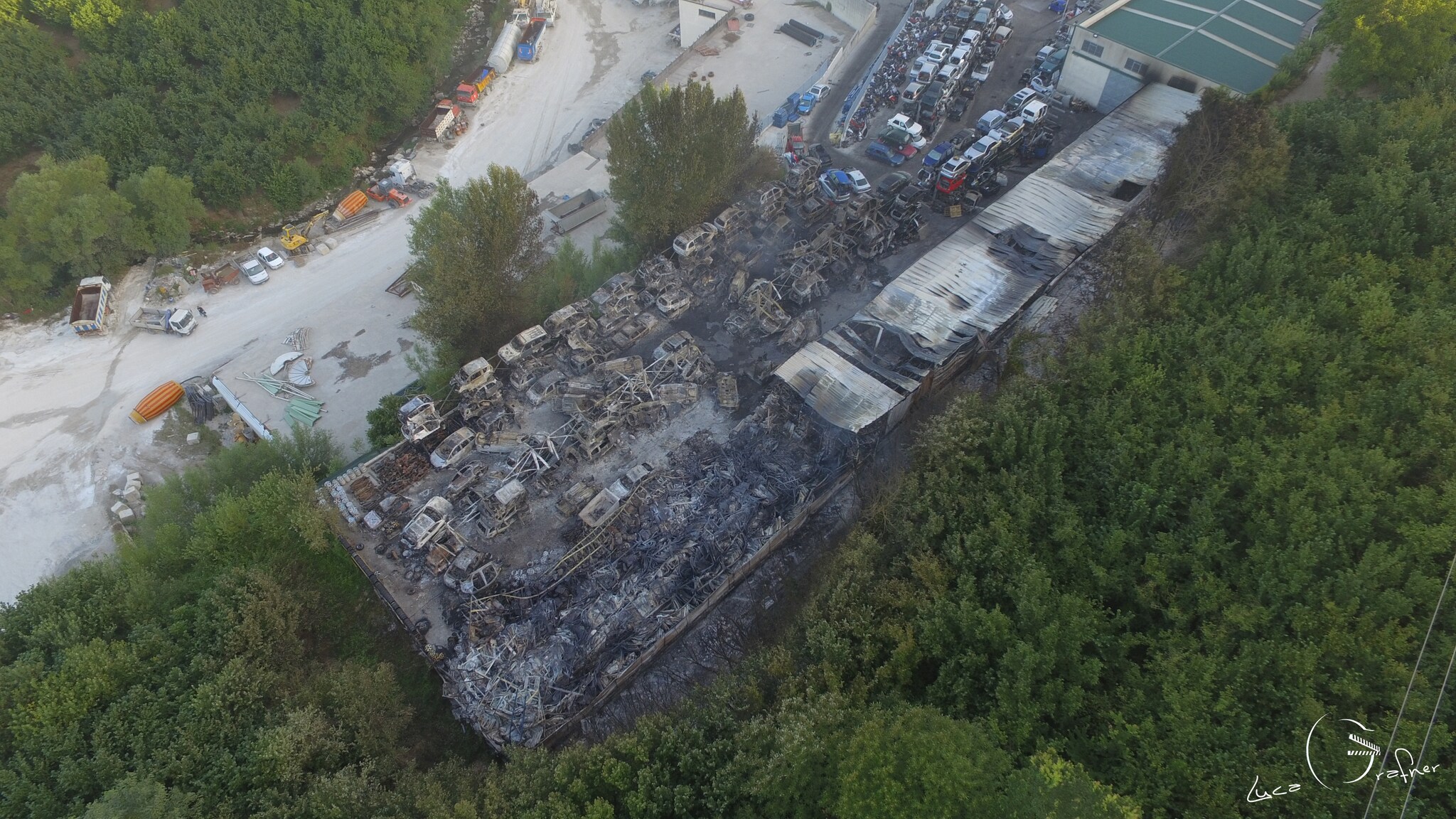 Foto dall'alto sull'incendio al centro di demolizione auto di Atripalda (Avellino).