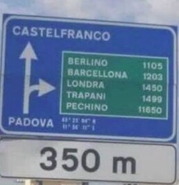 Il Comune di Padova si distingue per un'iniziativa davvero molto particolare: cartelli stradali "creativi". L'idea nata nel 2010, a opera dell'allora vicesindaco e assessore alla Mobilità Ivo Rossi, ha visto spuntare lungo la tangenziale una serie di segnali stradali innovativi. Ecco allora che ad alcune centinaia di metri dallo svincolo autostradale per Padova Est un cartello indica che andando dritti si arriva Castelfranco Veneto, a destra a Berlino (1.105 km), Barcellona (1.203 km), Londra (1.450 km), Trapani (1.499 km) e Pechino (11.650 km); il motivo delle bizzarre indicazioni? Comunicare la centralità di Padova, città nel cuore dell'Europa.
