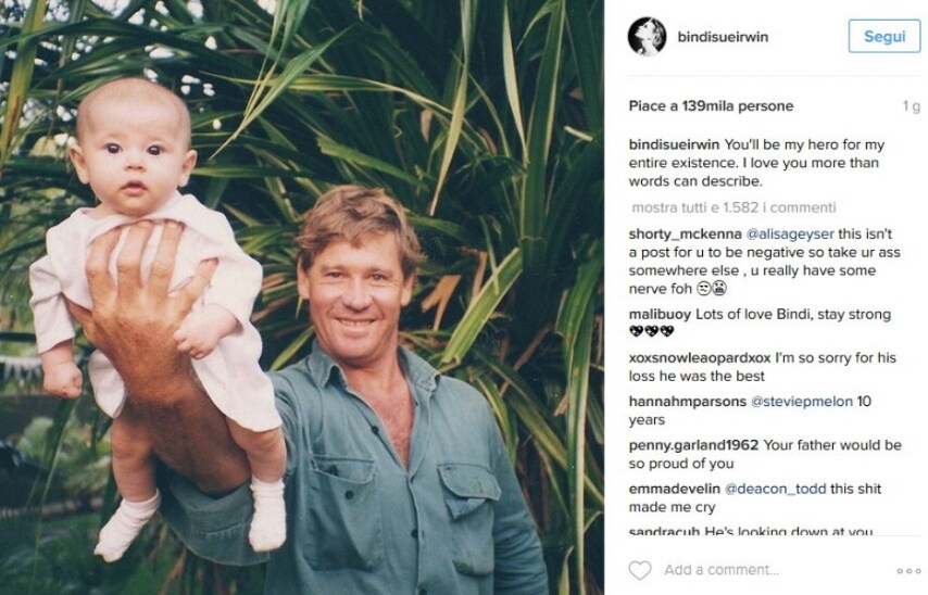 Bindi Irwin era solo una bambina quando suo padre, il naturalista e divulgatore scientifico Steve Irwin, conosciuto in tutto il mondo grazie al programma "Crocodile Hunter" (cacciatore di coccodrilli), perse tragicamente la vita. Era il 4 settembre 2006, e mentre Irwin stava realizzando un documentario subacqueo sulla fauna della Grande barriera corallina, fu punto al petto da un pesce velenoso che non gli lasciò scampo. Ora Bindi è diventata una giovane donna e da suo padre ha ereditato lo stesso amore e la stessa passione per la natura e gli animali; su Facebook lo ricorda così, con parole dolci e toccanti: "Resterai per sempre il mio eroe. Ti voglio bene, più di quanto si possa esprimere a parole".