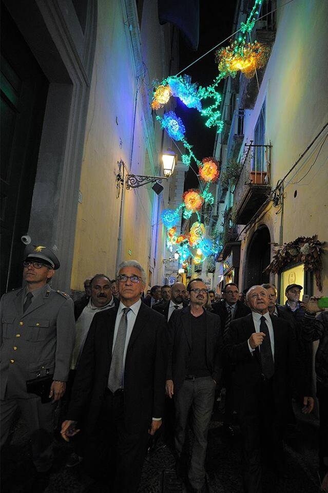 Inaugurata sabato 5 l'edizione 2016 delle luci d'artista a Salerno. Tra i presenti anche l'attore Rocco Papaleo. Due le novità di quest'anno:“Il Cielo Stellato” e la ruota panoramica sul lungomare. (foto Facebook/comune di salerno - Massimo Pica e da facebook.com/lucidartistacomunesalerno)