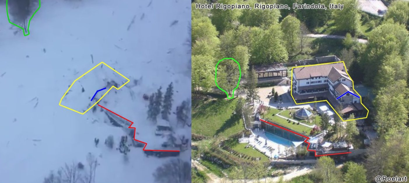 La comparazione di alcune immagini del prima e dopo dell'Hotel Rigopiano travolto dalla slavina. Su Twitter Roeland Smit ha postato queste immagini che mostrano come la struttura sia sta spostata di decine di metri.