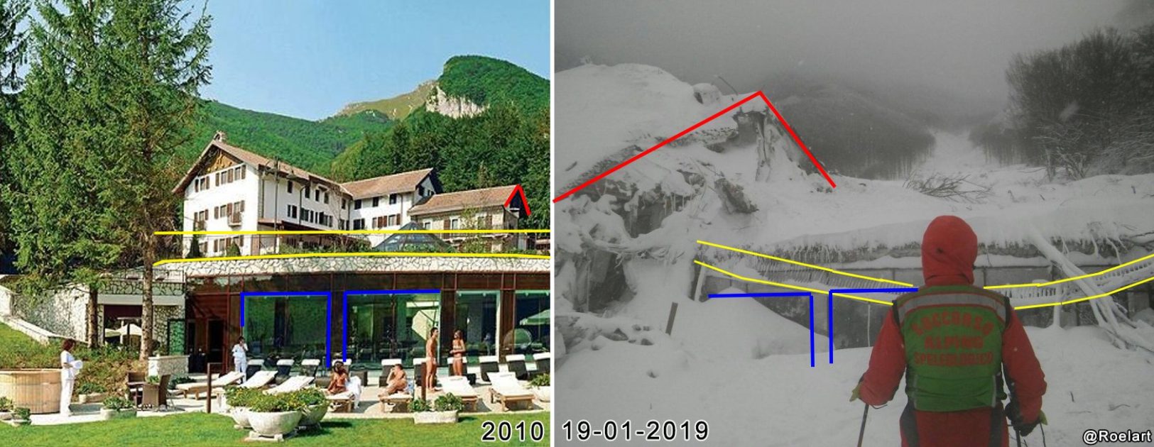 L'hotel Rigopiano spostato di decine di metri dalla valanga: il confronto prima e dopo