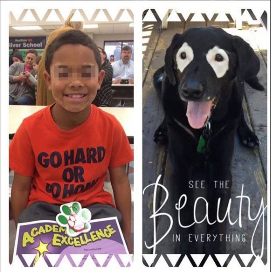 Il cagnolino nero con le macchie bianche sugli occhi e sulla pancia si chiama Rowdy ed è un labrador. Solo un anno fa il cane ha iniziato a riempirsi di macchie e a soffrire di una malattia cutanea, la vitiligine, che provoca delle chiazze depigmentate sulla pelle. Il cucciolone era stato abbandonato dalla sua vecchia famiglia per questa lieve imperfezione che, pur se non fatale, rende il soggetto "speciale". Fortunatamente Rowdy ha trovato una famiglia disposta a dargli tanto amore: ora il labrador ha 13 anni e vive a Portland (OR). Le macchie, anche se sono una deformazione del pigmento cutaneo, rendono il piccolo animale molto particolare infatti molte persone si fermano per saperne di più. La voglia di vita di Rowdy, scampato a diverse avversità, adesso è un simbolo di forza anche per alcuni bambini che vivono la sua stessa situazione. La pet therapy aiuta i piccoli umani a non sentirsi diversi.
