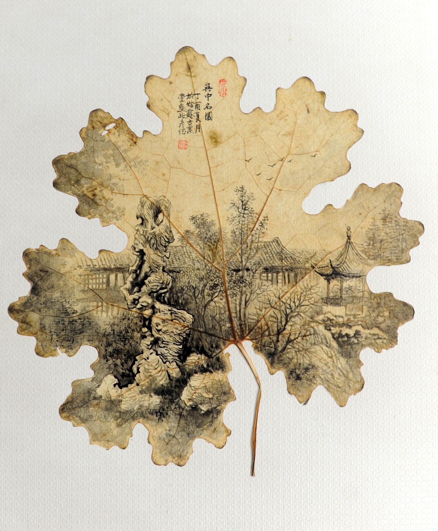 Pang Yande, l'artista cinese che dipinge sulle foglie, dopo averle raccolte.
