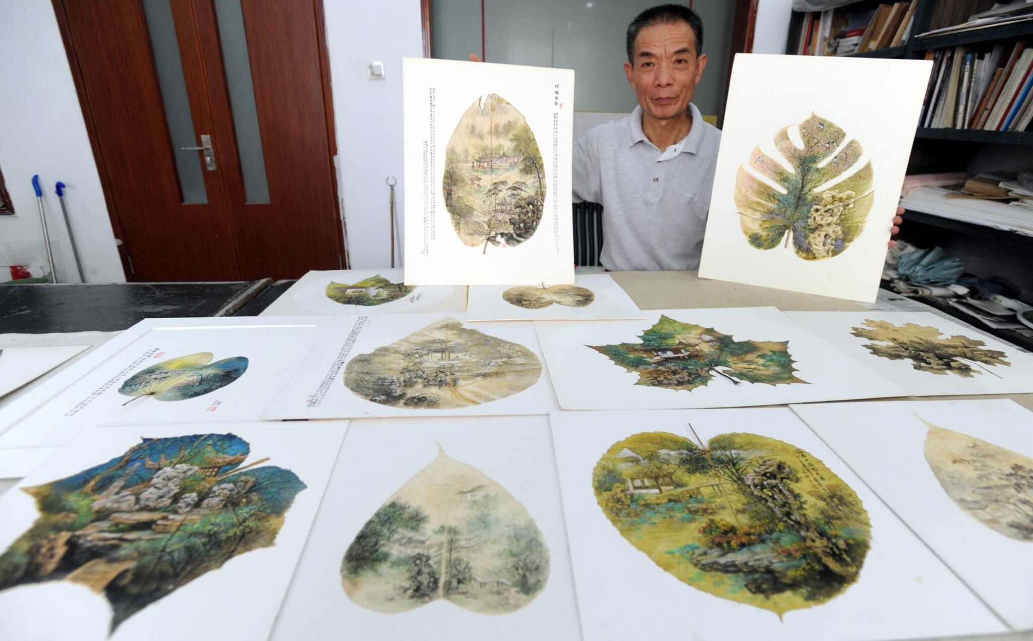 Pang Yande, l'artista cinese che dipinge sulle foglie, dopo averle raccolte.