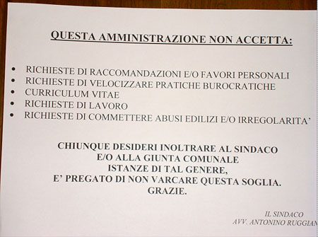 In molti uffici pubblici funzionari o politici (meglio se sindaci) tengono in bella evidenza gli avvertimenti destinati ai cittadini: non chiedete raccomandazioni né atti contrari alla legge. E infine, il disperato appello del barista: "Nei cornetti vuoti, semplicemente, non c'è niente".