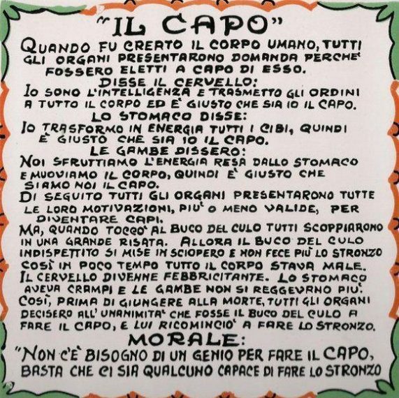 In molti uffici pubblici funzionari o politici (meglio se sindaci) tengono in bella evidenza gli avvertimenti destinati ai cittadini: non chiedete raccomandazioni né atti contrari alla legge. E infine, il disperato appello del barista: "Nei cornetti vuoti, semplicemente, non c'è niente".
