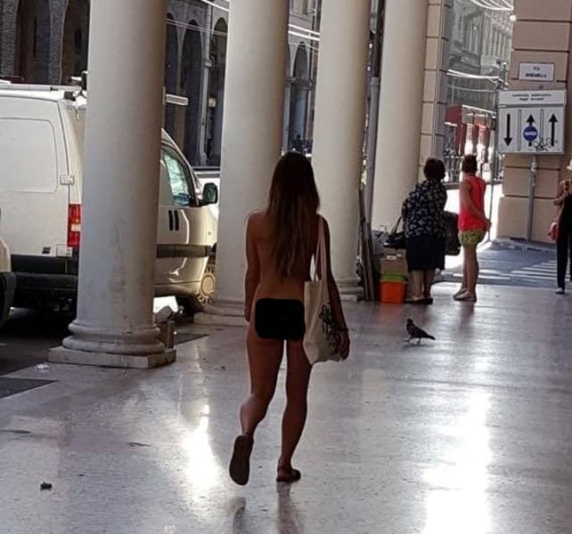 Una donna di età compresa tra i 20 e i 30 anni è stata immortalata mentre passeggiava, completamente nuda, nel centro di Bologna. Non si per quali motivi abbia deciso di uscire di casa senza veli, ma qualcuno ipotizza che possa trattarsi di una scommessa perso oppure di una sorta di esperimento sociologico.