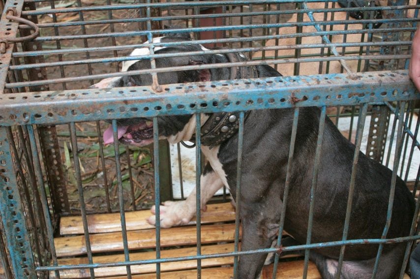 Un cane tenuto in gabbia prima del combattimento