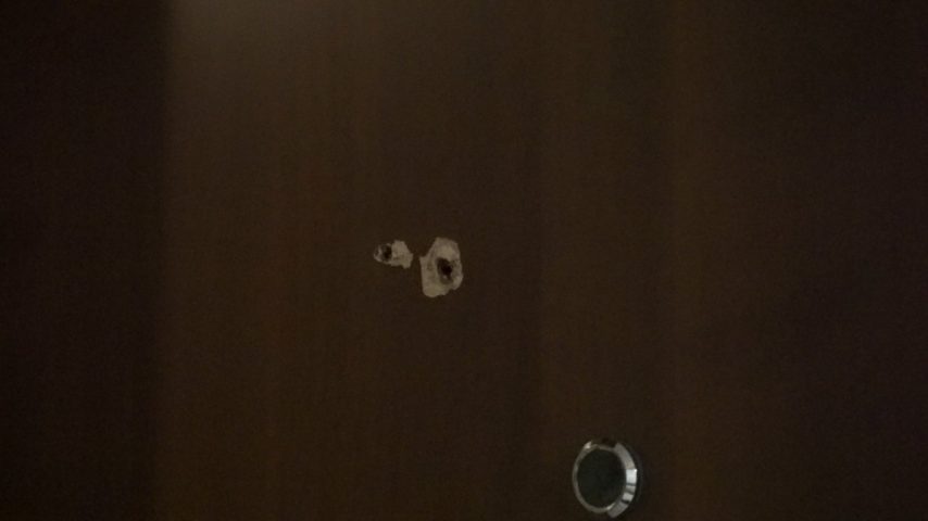 Il portone di casa di Silvano Spada crivellato dai proiettili