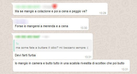 "Il mio record è sedici giorni senza mangiare" scrive una ragazza con una punta di orgoglio. "E non mangiavi nulla? Bevevi soltanto?" chiede con stupore un'altra. "Sì, solo the, infusi e acqua e limone. Io sapevo che può sopravvivere senza mangiare fino a 50 giorni". Questo è solo uno dei terribili messaggi che si possono trovare nelle ormai famose chat "pro Ana".